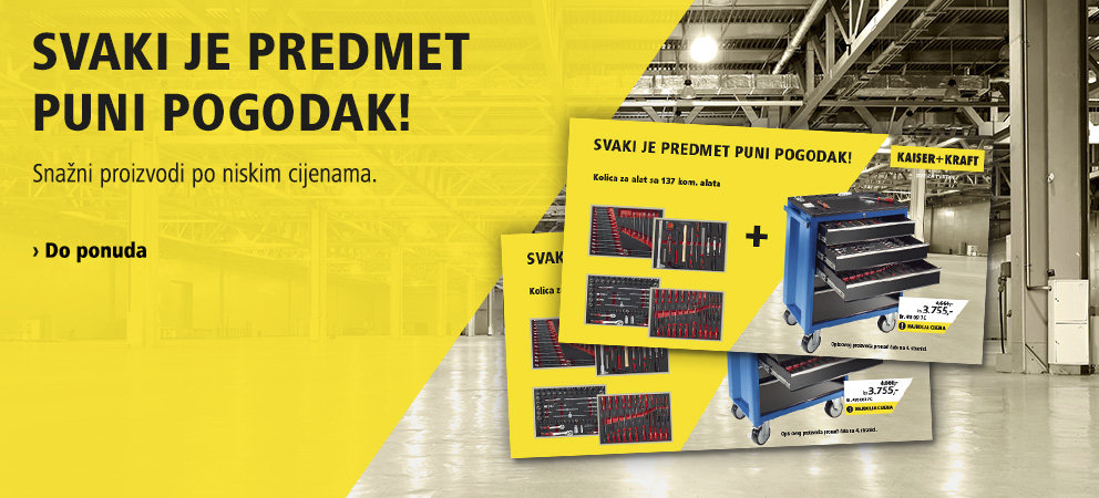 Krenimo u online trgovinu tvrtke KAISER+KRAFT Hrvatska: u bogatom robnom asortimanu jedva da postoji nešto što nećete pronaći. Ne nudimo Vam samo vrhunske marke kao što su Kärcher visokotlačni čistač, Rau radni stolovi ili Zarges ljestve, već ćemo Vas zadiviti i vlastitim markama od kojih su brojne »Made in Germany«. Uz EUROKRAFT ćete primjerice dobiti veliku sigurnost planiranja zahvaljujući 5-godišnjim postprodajnim uslugama i 10-godišnjem jamstvu na sve premium proizvode. EUROKRAFT osim toga dolazi i u zelenoj varijanti: ACTIVE GREEN klijente oduševljava svojim proizvodima s ekološkom bilancom i ambalažom koja se može reciklirati. QUIPO je fer marka u portfelju tvrtke KAISER+KRAFT – uz 5 godina jamstva i poštene cijene. A OFFICE AKKTIV će Vas jako brzo dovesti do osobnog ureda s 5 zvjezdica.